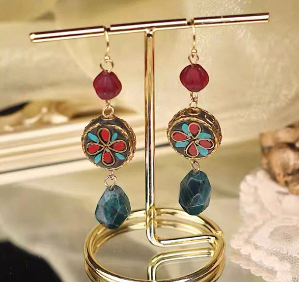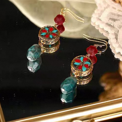 These Tibetan earrings, with intricate brass filigree and vintage red glass lantern beads, encapsulate harmony and fortune at the ear. The clover design on the lucky bead blooms like a lucky flower, symbolizing endless blessings and beauty.