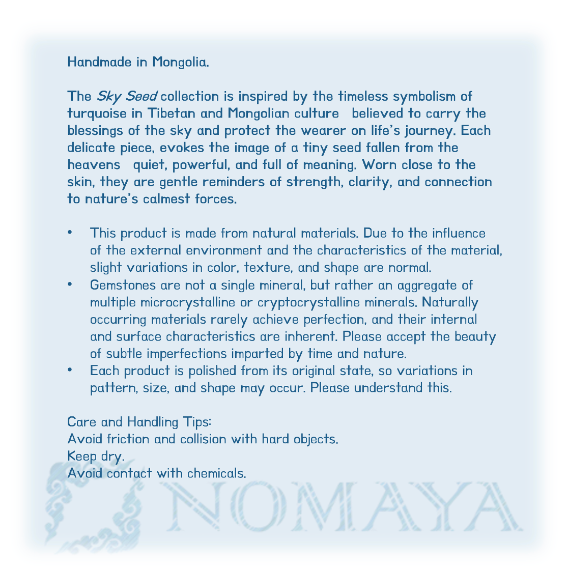 Inspired by the pure blue of the open steppe and the talismanic traditions of Tibetan and Mongolian cultures, the Sky Seed series brings you a collection of delicate turquoise pieces, designed as modern-day guardians for everyday life.
